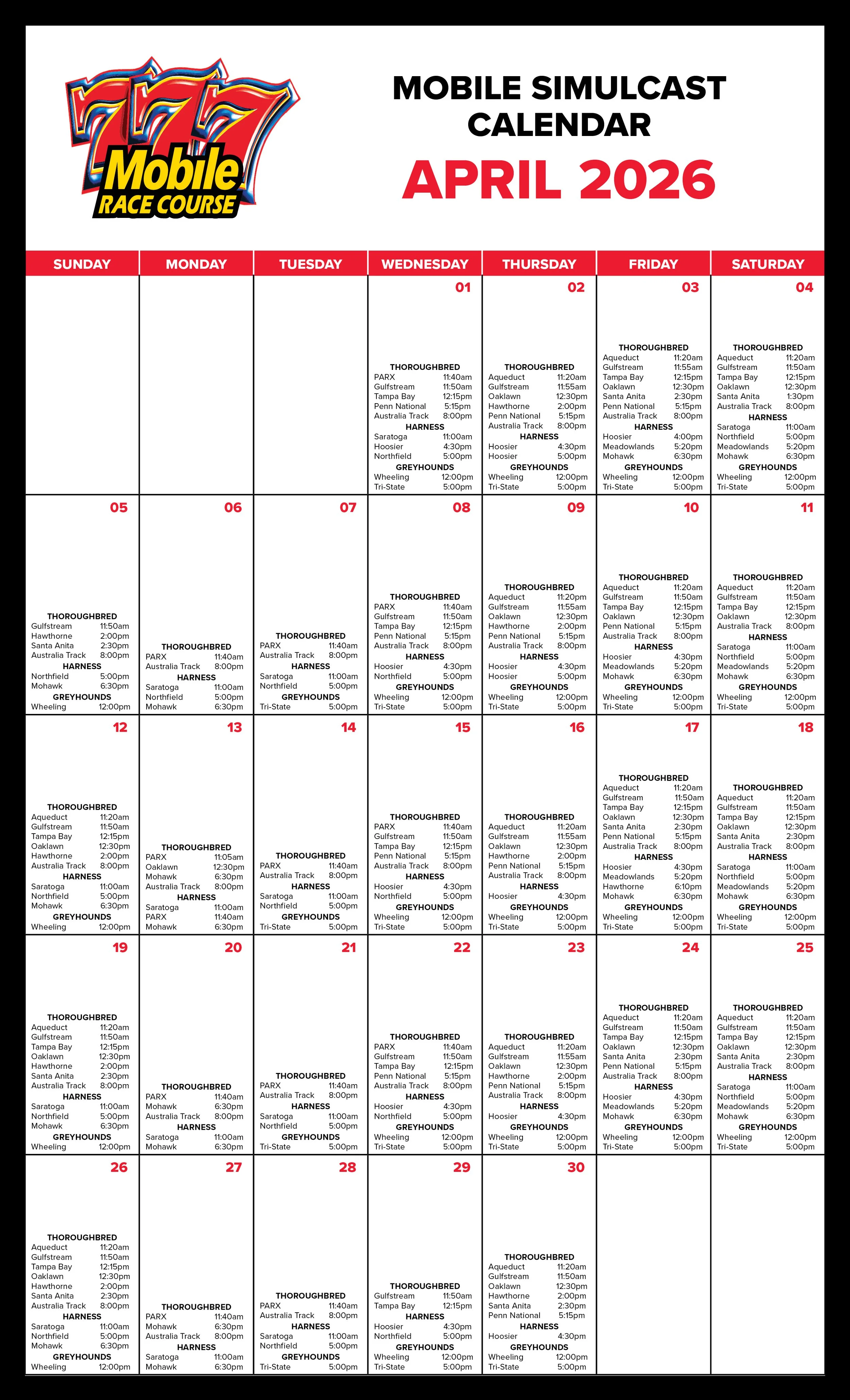 Simulcast is the simultaneous broadcasting of multiple races at different venues, shown on screens here at the Mobile Race Course. Racing fans interested to know what is happening around the area's racing tracks can watch live simulcasts from venues including Orange Park, Palm Beach, Naples, Tri-State, Gulfstream, Santa Anita, Golden Gate, St. Johns, and more.